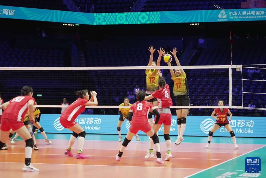 11月8日,山东队球员王文涵(左上)和谢盛彦(右上)在比赛中拦截球。 On the same day, in the Group B match of the Volleyball Women's Adult Group match of the 15th National Games in Macau, the Shandong team defeated the Liaoning Team 3-1.新华社11月8日报道,山东队球员谢盛彦(右上)在比赛中进攻。 On the same day, in the Group B match of the Volleyball Women's Adult Group match of the 15th National Games in Macau, the Shandong team defeated the Liaoning Team 3-1.新华社