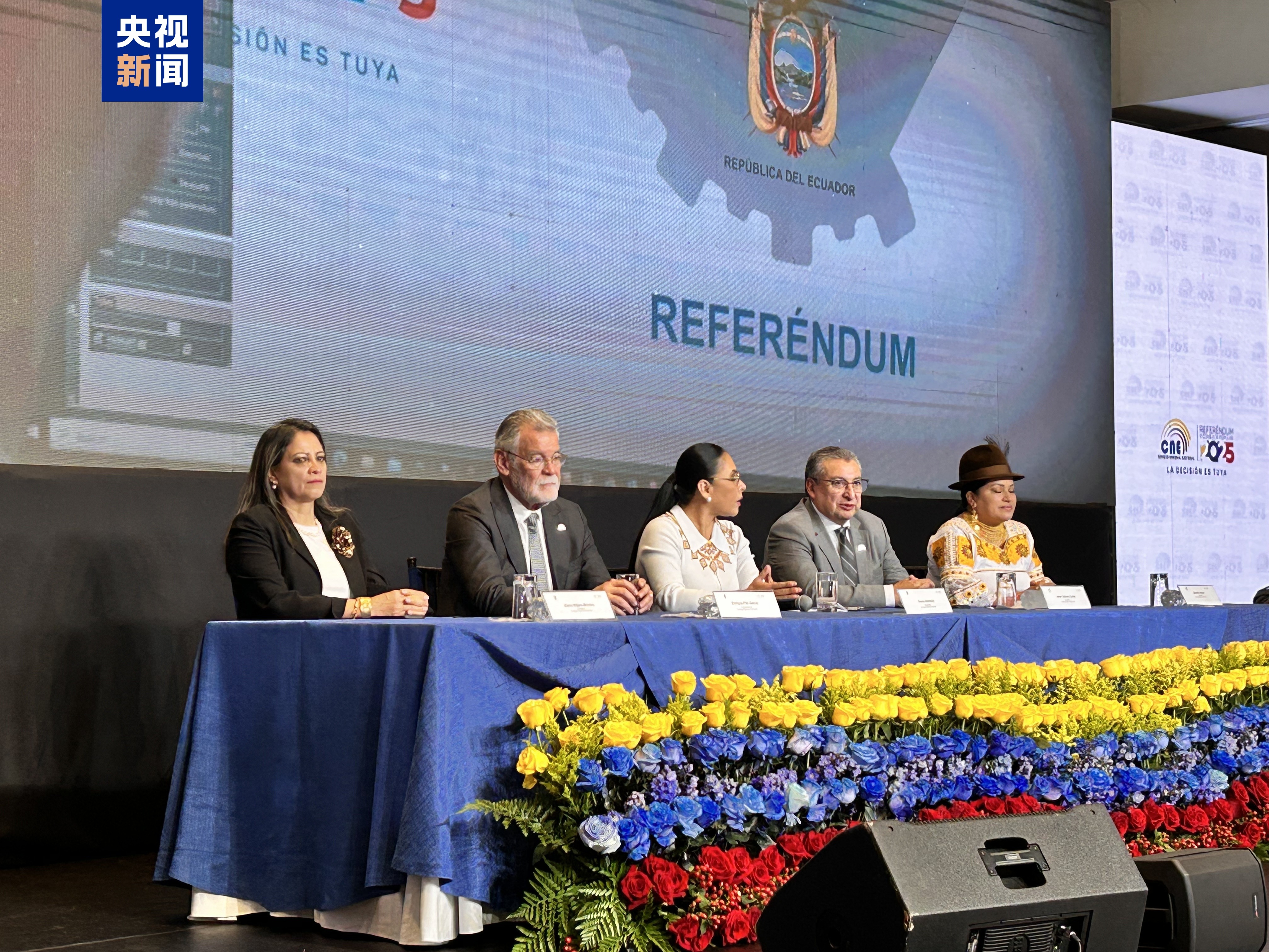 △厄瓜多尔选举委员会举行新闻发布会。厄瓜多尔全国选举委员会16日晚公布的计票初步结果显示,厄瓜多尔公民在当天举行的宪法公投中反对设立外国军事基地。厄瓜多尔总统诺瓦随后宣布尊重人民的选择。 (总台记者 邓雪梅)