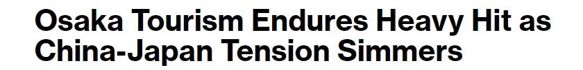文章称,大阪是日本第二大经济中心,经济活力强劲与旅游业密切相关。特别是近年来,中国游客是推动当地旅游消费的重要力量。但现在,这座城市引进的中国游客越来越少:大阪关西国际机场的航班削减幅度为全国之最,当地酒店、零售商和餐馆也面临大面积取消航班的情况。